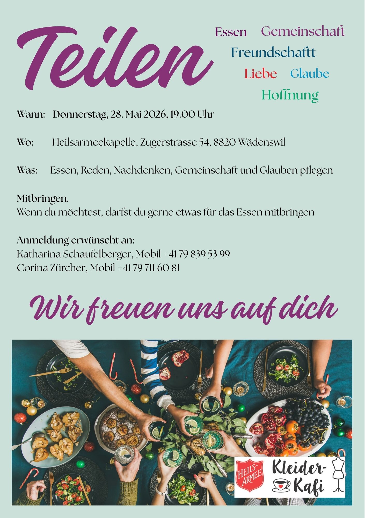 Wir bekommen und nehmen gut erhaltene und gewaschene Kleider an und Verkaufen sie sehr günstig. Es ist ein Angebot für Menschen mit einem kleinen Budget. Wir nehmen wahr, dass es auch in unserer Region immer mehr Menschen gibt, die von Armut betroffen sind und an sie richtet sich das Angebot. Das Kleider-Kafi ist für alle offen.